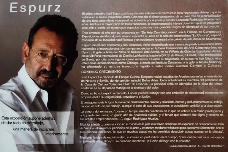 El artista cántabro José Espurz participa durante este mes de marzo en la feria neoyorquina Artexpo, que se celebra en el Javits Convention Center. Con esta cita el pintor campurriano da un paso más en la consolidación de una tarea ascendente y personal, ya advertida por el poeta y escritor Leopoldo Rodríguez Alcalde hace años. Asiduo a la mayor parte de ferias nacionales, la temperamental e intensa obra de Espurz se proyectará este año a través de numerosos espacios.